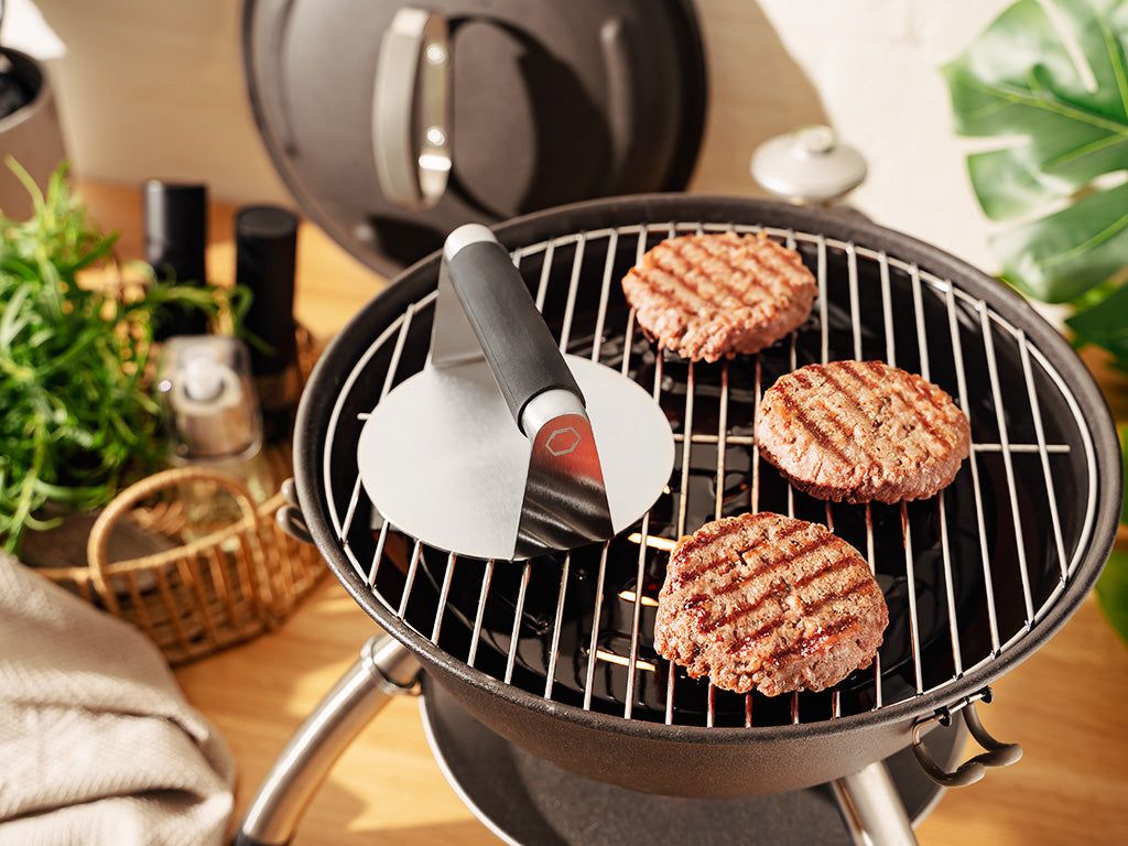 Men det er ikke alt – vi har gået den ekstra mil for at sikre, at din oplevelse er fejlfri. Det varmeresistente silikonehåndtag giver et sikkert greb, der tilbyder ikke kun holdbarhed, men også sikkerhed og komfort ved hver smash. Ingen mere bekymring om varme håndtag eller anstrengte håndled – det handler alt sammen om perfekte burgere uden kompromis.