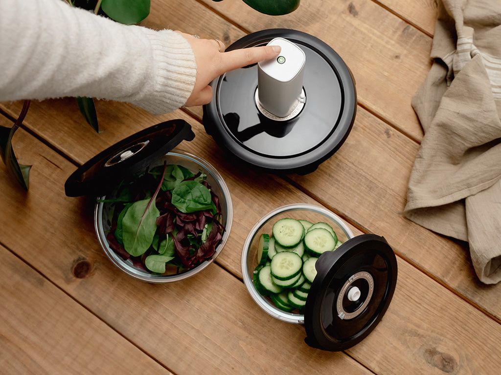 I vakuumbeholderen holder din mad op til fem gange så lang tid. Brug vakuumpumpen til at skabe et vakuum – og på få sekunder har du vakuumpakket mad klar til brug, når du har brug for det. Det smarte design gør det muligt at stable beholderne oven på hinanden, hvilket giver mere køleskabsplads til de øvrige dagligvarer. Og på oversiden af låget kan datoen angives, så du nemt kan styre, hvor længe maden har været under vakuum.