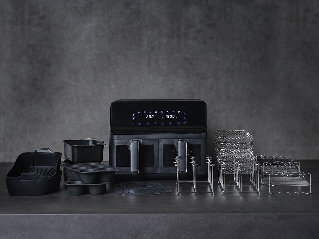 Pommes frites, fisk eller filet til to, fire, seks eller flere personer? ONYX COOKWARE™ AIRFRYER har en tilberedningskapacitet på 4+4 liter og dobbelte skuffer, hvilket placerer den i kategorien for stor Airfryer kapactitet