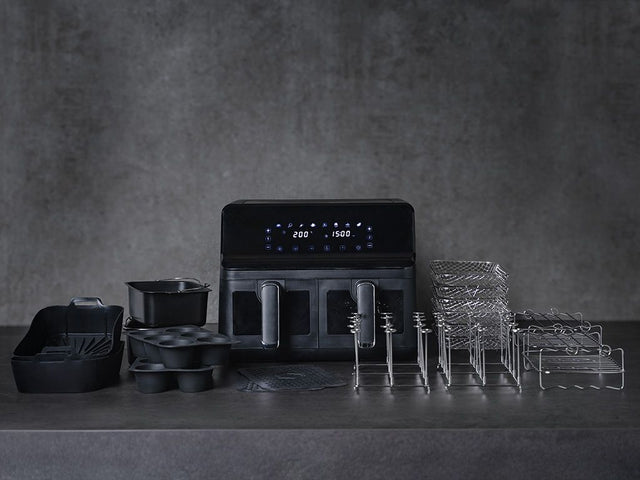 Vores ONYX COOKWARE™ AIRFRYER giver dig dobbelt så meget sjov! Med to separate skuffer kan du tilberede to forskellige retter samtidig eller tilberede retterne separat, hvilket halverer din tilberedningstid!