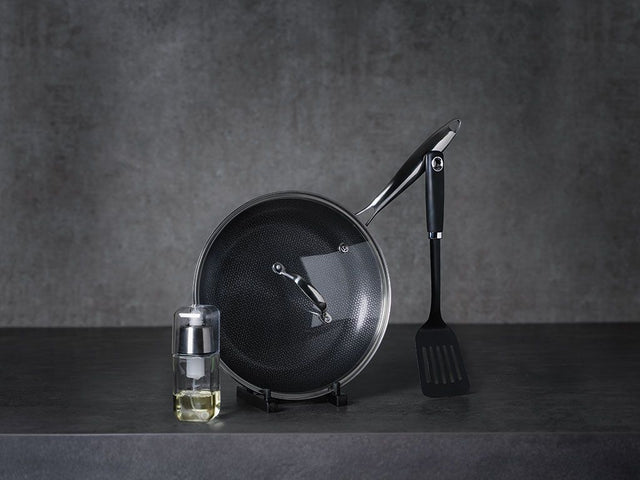 Det, der virkelig adskiller vores produkter fra almindelige gryder og pander, er den unikke lasergravering, der skaber det patenterede ONYX COOKWARE™ sekskantede design. Denne unikke proces skaber en række toppe og dale på gryderne og panderne. I dalen er det et keramisk non-stick materiale, der sikrer, at du får den bedste non-stick funktionalitet og nem rengøring. Toppene af rustfrit stål giver holdbarhed, perfekt stegning af dit kød og muligheden for at bruge metalredskaber. Derfor kalder vi vores gryder og pander "hybrid". De giver dig det bedste fra to verdener: Den non-stick funktionalitet, vi alle ønsker i vores gryder og pander, og holdbarheden fra en professionel rustfri stål- eller støbejernspande.