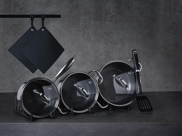 Det, der virkelig adskiller vores produkter fra almindelige gryder og pander, er den unikke lasergravering, der skaber den patenterede ONYX COOKWARE™ sekskantede design. Denne unikke proces skaber en række toppe og dale på gryderne og panderne. I dalen er det non-stick materiale, der sikrer, at du får den non-stick funktionalitet og nem rengøring. En af topene er rustfrit stål, der giver holdbarhed, perfekt stegning af dit kød og evnen til at bruge metalredskaber. Derfor kalder vi vores gryder og pander "hybrid". De giver dig det bedste fra to verdener: Den non-stick funktionalitet, vi alle ønsker i vores gryder og pander, og holdbarheden fra en professionel rustfri stål- eller støbejernspande.