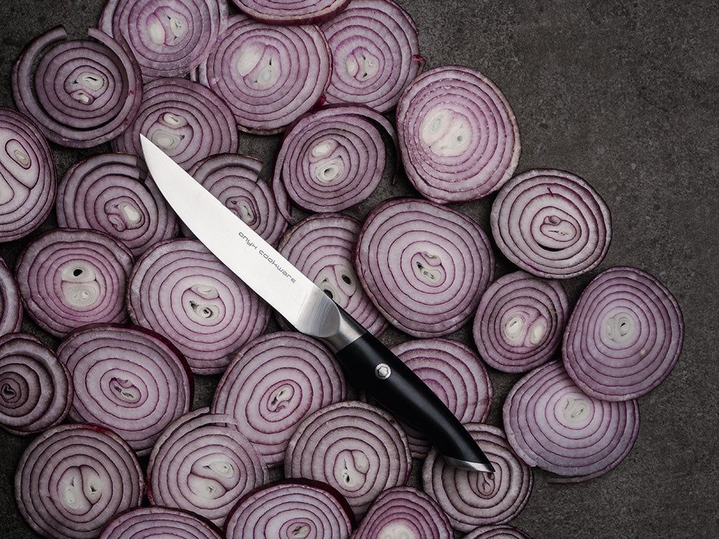 ONYX COOKWARE™ Universalkniven er god til at hakke og skære mindre madvarer og grøntsager, og er et ideelt værktøj til madforberedelse. Den deler mange af egenskaberne ved en kokkekniv, men dens mere kompakte størrelse gør den til et nyttigt værktøj, når du arbejder med mindre madvarer, da universalkniven tillader mere præcist skærearbejde. Så når din ONYX COOKWARE™ Kokkekniv er lidt for stor til jobbet, vil du række ud efter universalkniven i stedet.