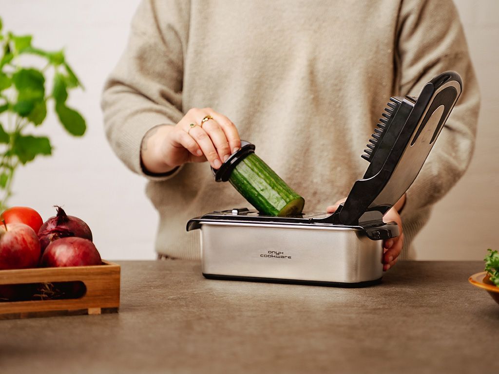 Denne hakker er lavet i 100 % rustfrit stål og forener robust holdbarhed med et stilrent, moderne look. Den smarte låsemekanisme holder klingerne sikkert på plads under brug, så du kan arbejde trygt og uden bekymringer. Når arbejdet er gjort, klarer de opvaskemaskinevenlige dele nemt rengøringen. Uanset om du skærer, hakker eller laver spiraler, gør dette alt-i-en redskab madlavningen enklere – og sparer dig både tid og kræfter