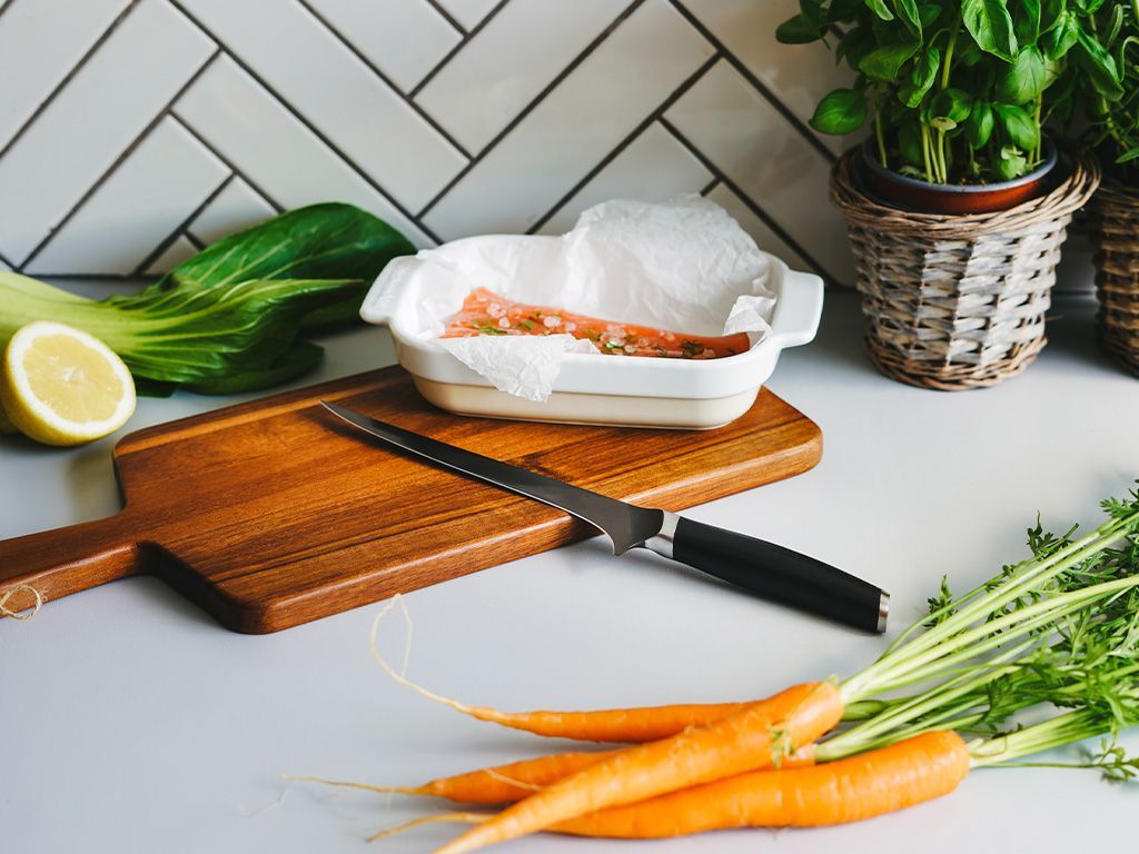 FILETKNIVENS ekstremt tynde og fleksible klinge gør det muligt for kniven at bevæge sig glat langs fiskens rygrad og fjerner og skærer let igennem fiskens skind og knogler – ligesom at skære i smør!
