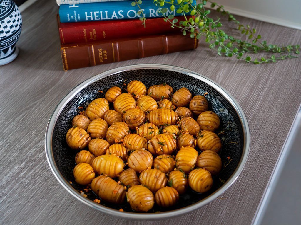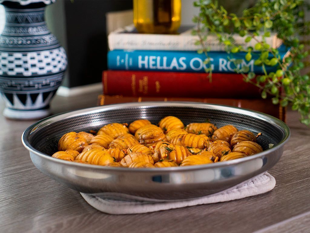 Forestil dig, at du vil sætte stegepanden i ovnen, men indser, at din ovn er ret lille, eller at du allerede har en masse andre ting i ovnen, og du kan simpelthen ikke få plads til en fuldstørrelse stegepande med håndtaget derinde. Endnu et problem, som vores håndtagsløse stegepander løser!