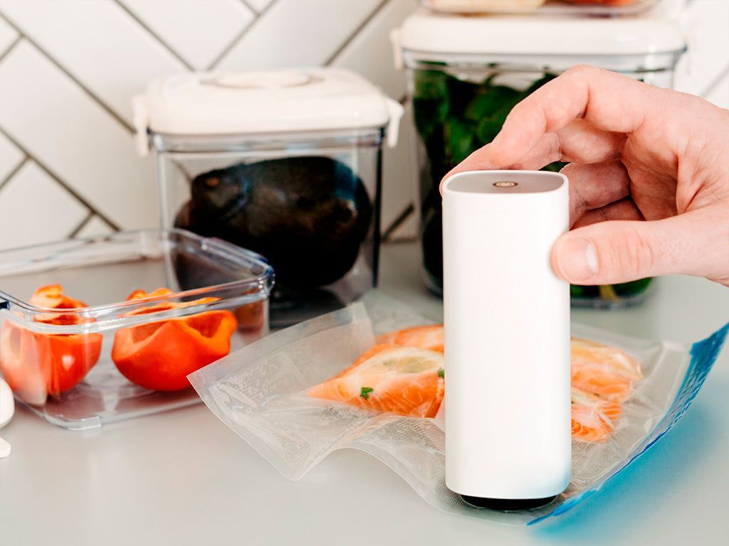 De fleste af os har også prøvet at bruge vakuumforsegling, da det er langt den bedste måde at opbevare madvarer på i længere tid uden at fryse dem – og selv ved nedfrysning er vakuum en klar fordel. Men en almindelig vakuumforsegler er jo ikke så praktisk. Du skal have en kæmpe vakuummaskine, som du skal finde i skabet og så sætte i stikkontakten. Så skal du finde vakuumposerne og bruge maskinen til at lave vakuum og forsegle posen ved faktisk at smelte plasten. Vi har selv haft de maskiner – men til sidst blev de bare i skabet, fordi de bare var så bøvlede og besværlige at bruge.
